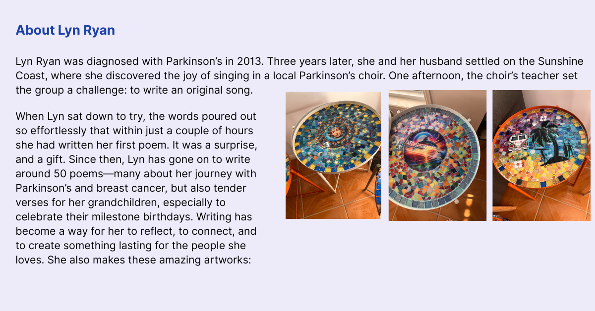 Bridging the gap between academic knowledge and real-world experiences of Parkinson’s through accessible, creative resources.