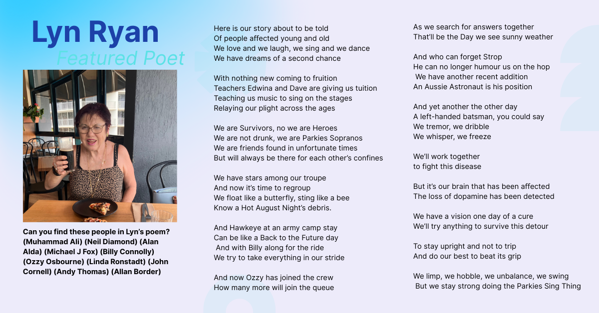 If you live with early or late age Parkinson’s, we would love to share your unique stories expressed through poetry. Submit a poem you have written and include a short bio.